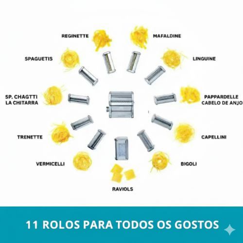Tem a possibilidade de fazer 11 cortes e formas diferentes de massa, permitindo preparar de forma simples e rápida lasanhas, fettuccine, tagliolini, espaguete, reginette, ravioli e muito mais
