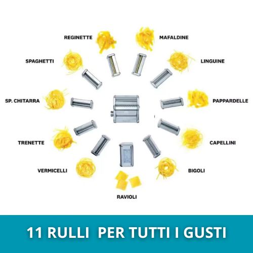Hai la possibilità di realizzare 11 diversi tagli e forme di pasta così da preparare in modo semplice e veloce lasagne, fettuccine, tagliolini, spaghetti, reginette, ravioli e tanto altro